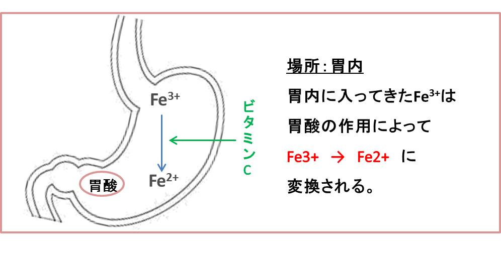 鉄の吸収は主に十二指腸・空腸で行われますが、その前に胃で鉄を吸収に適している形にします。