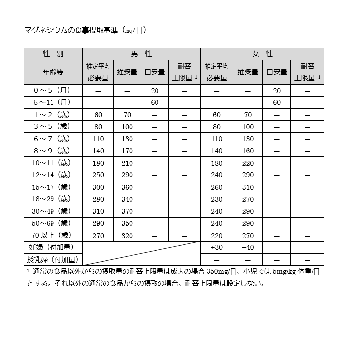 | マグネシウムは、血管を拡張させて血圧を降下させる働きがあり、正常な血圧や血液の循環を保つ働きがあります。 |